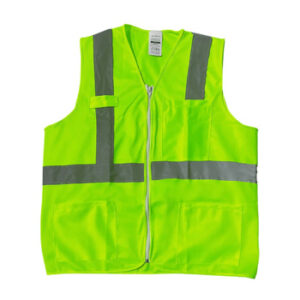 Chaleco de malla verde marca Safety Store, modelo CHA-POLI-V, unitalla. Ideal para trabajadores expuestos al tráfico intenso, exteriores, industrias de construcción, minería, transporte y supervisión. Fácil de limpiar, con cintas reflectantes, cierres de seguridad y tres bolsas delanteras.