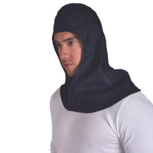 Capucha de mezclilla con cierre, marca DermaCare, modelo ME-9710, protege del calor y chispas en procesos de corte y soldadura. Fabricada en mezclilla 100% algodón, color negro. Unitalla, certificación de Conformidad Europea.