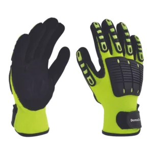 Guante de nylon fluorescente amarillo con pvc en dorso y dedos, nitrilo negro en palma con gomas internas. Ideal para armadoras automotrices, construcción y metalmecánica. Ajuste con cinta de velcro en el puño y protección adicional en dedos y palma con tiras de pvc negro y amarillo. Reforzado entre los dedos pulgar e índice.