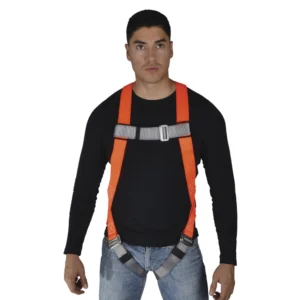Arnes de seguridad color naranja y gris, resistente y seguro para trabajos en alturas. Cumple con la norma EN-361.